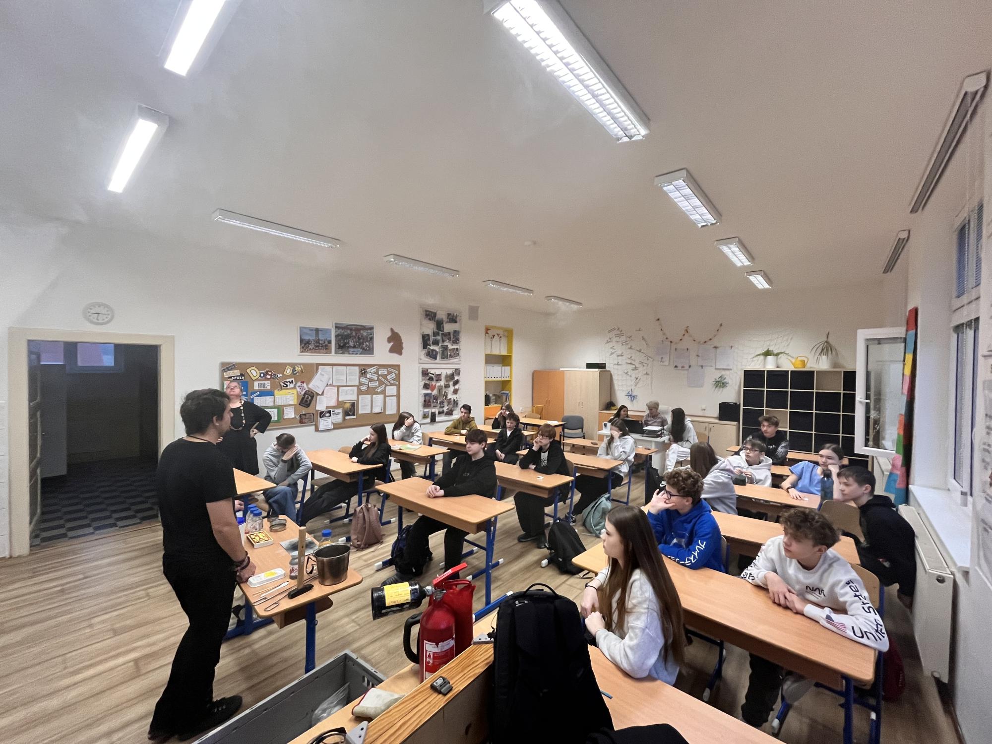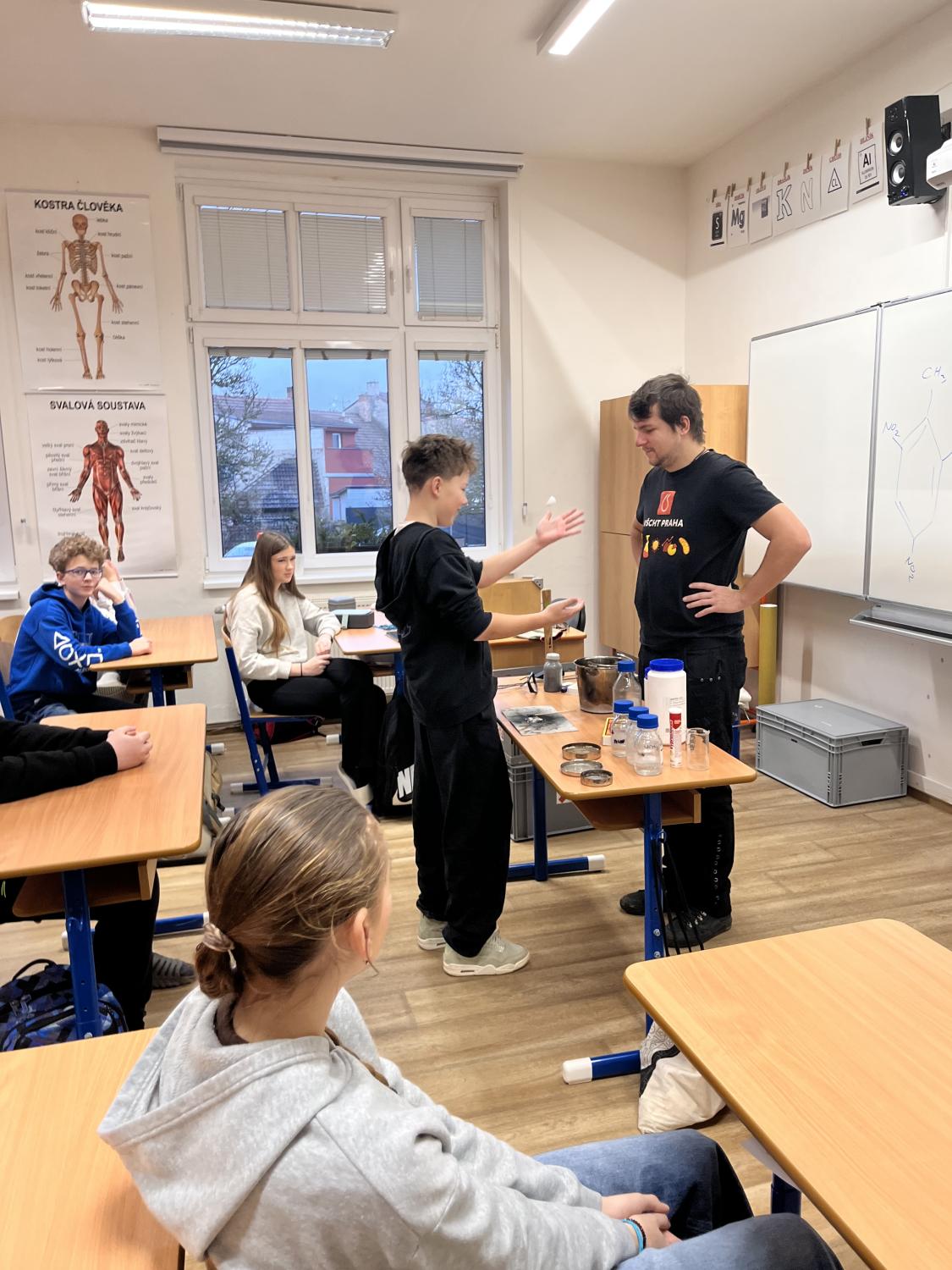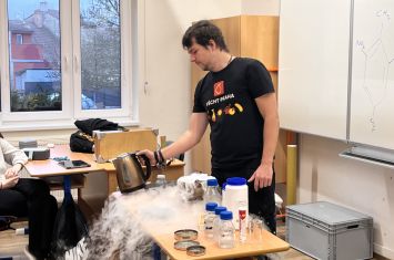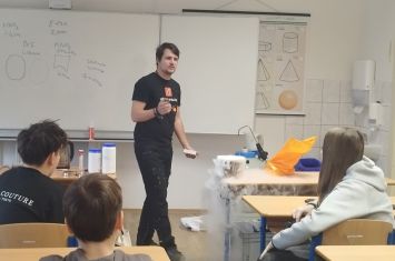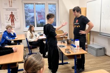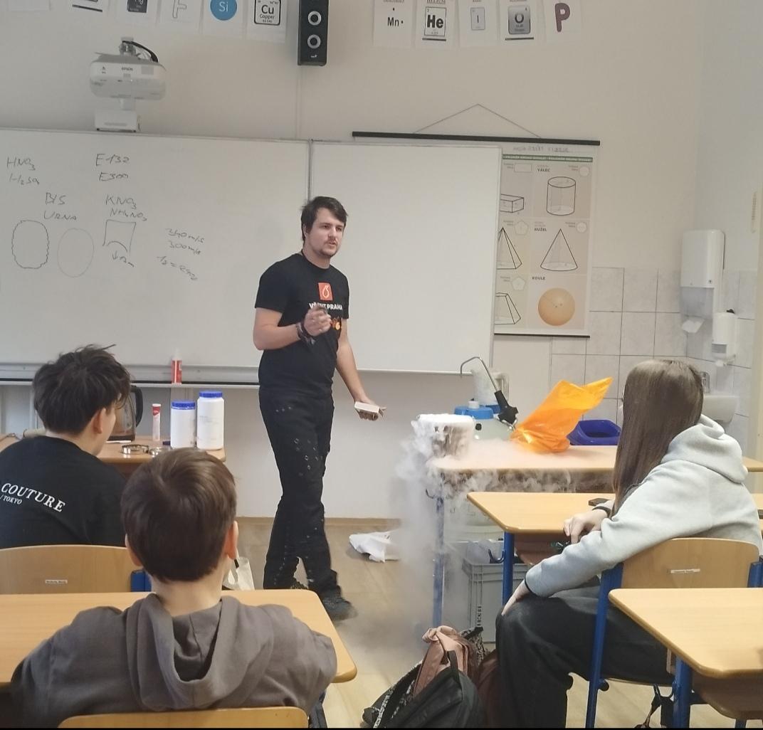 Středeční dopoledne 28. 1. 2026 bylo na naší škole věnováno chemickým experimentům. Navštívil nás totiž student pražské VŠCHT s projektem „HODINA MODERNÍ CHEMIE“. Tento projekt popularizuje chemii a její moderní metody, poukazuje na její nejnovější trendy a praktické aplikace. V 8. ročnících byl dětem interaktivní formou představen „ÚVOD DO CHEMIE“. Seznámily se zde např. s pojmy „CHEMICKÝ SEMAFOR“, „SUCHÝ LED“, byly jim představeny vlastnosti kapalného dusíku. Závěr celého programu pak byl zpestřen ochutnávkou zmrzliny připravené pomocí kapalného dusíku.