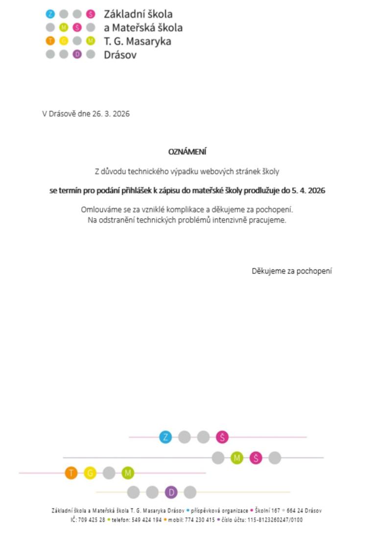 Zápis do MŠ Drásov pro školní rok 2026/2027 - online přihláška