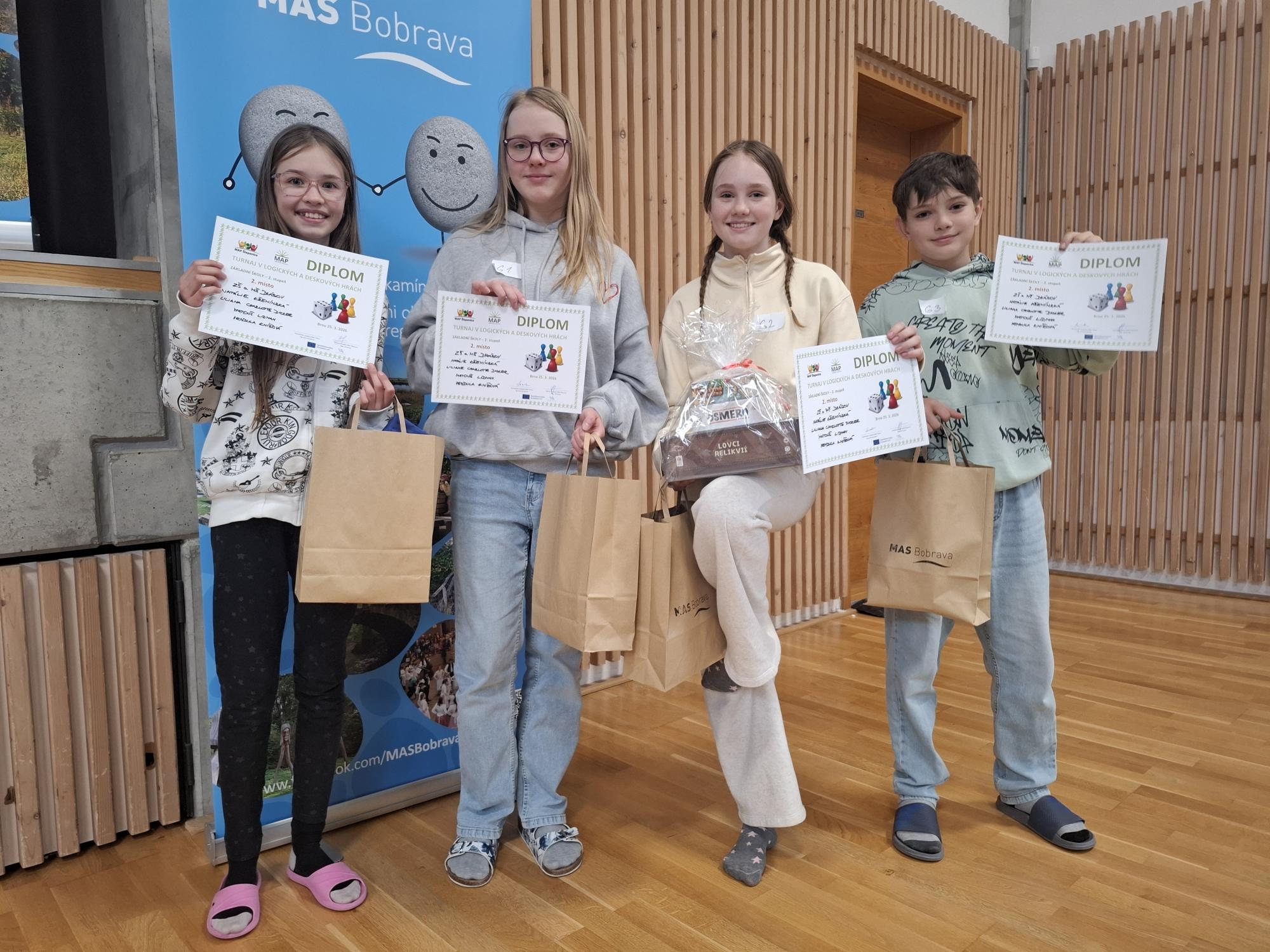 I pro děti z 2. stupně byl letos připraven (již 5. ročník) Turnaje v logických a deskových hrách. Drásovská škola vyslala v této kategorii do soutěže svůj tým však teprve poprvé. Jelikož nebylo vůbec jednoduché sestavit tým z žáků 6.-9. třídy, do Nebovid u Brna odjel nakonec ve středu 25.3. 2026 pravděpodobně nejmladší tým v historii soutěže, složený ze dvou páťáků, šesťačky a sedmačky.